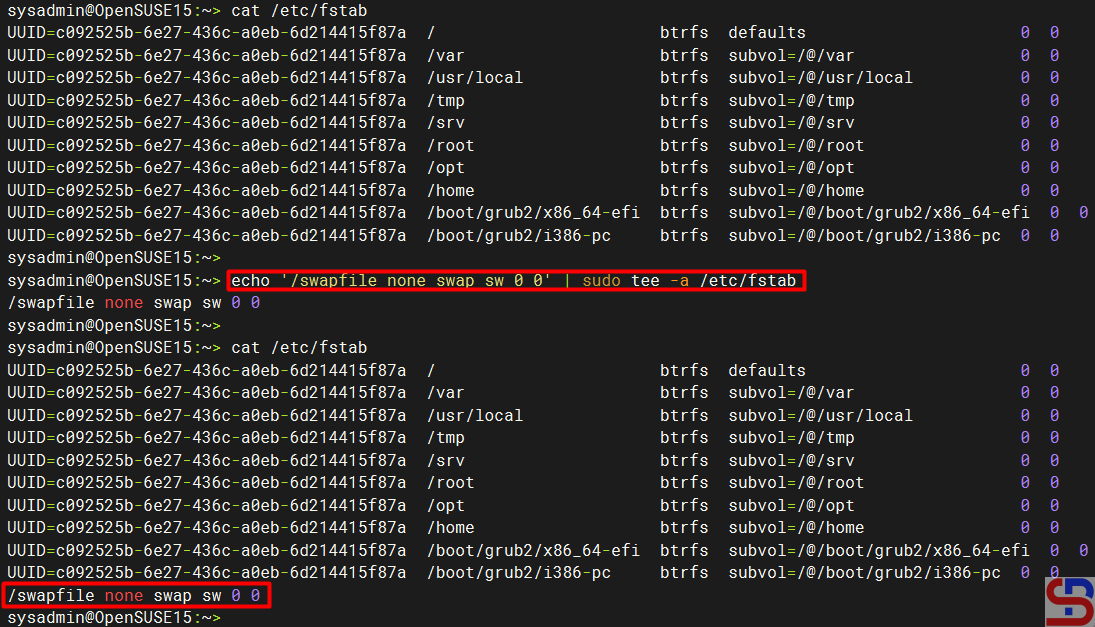 echo '/swapfile none swap sw 0 0' | sudo tee -a /etc/fstab
