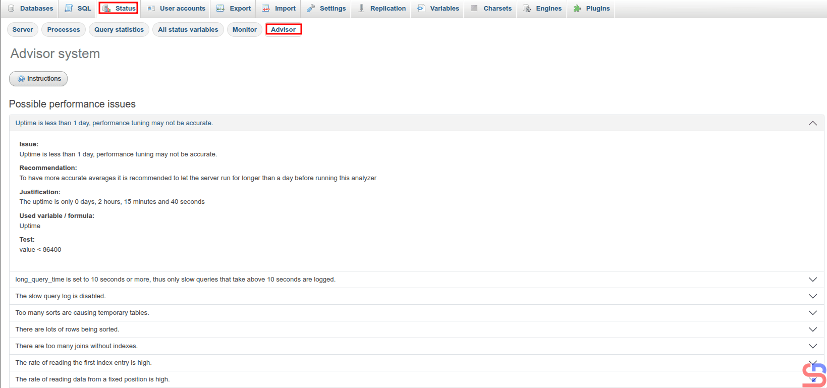 And in the console section, you can also perform queries by pressing Ctrl+Enter after you write the query. In fact, this application also provides an advisor feature to provide recommendations for your MariaDB database, as shown in the image below: