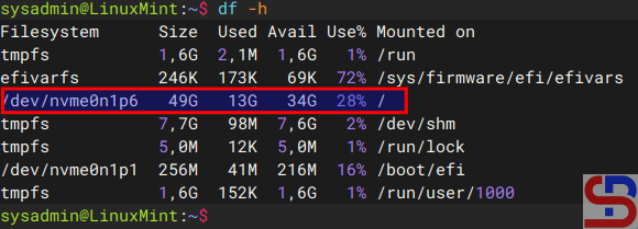 From the image above you can see that 2 partitions in Linux have a hard disk size of 60 GB and 49 GB respectively. But when I display the hard disk size using df -h command, I just see only one partition like in the image below: