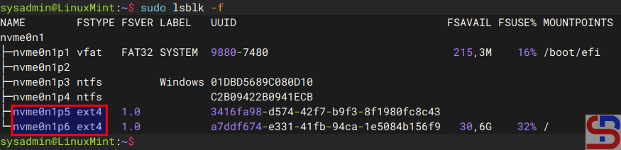 From the image above, the “invisible” partition has an ext4 format type. If the partition is not formatted, format it using the command below if you want an ext4 format for the partition and adjust it to the name of your Linux partition: