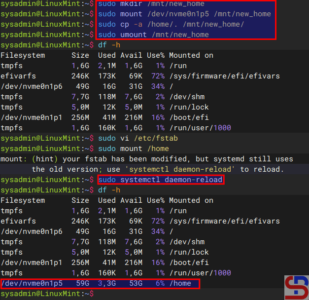 Try to reboot the device to make sure the folder remains after the device reboots and the /home folder should be mounted from /dev/nvme0n1p5. If something goes wrong, you can restore the old home with the command below: