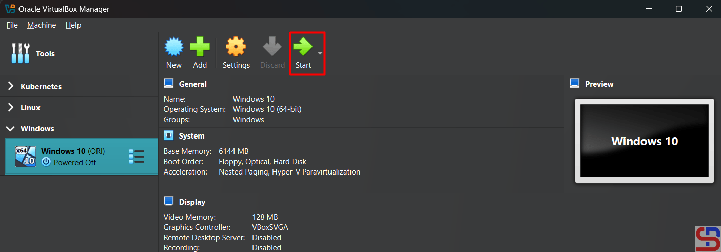 Click the OK button. After that, turn on your virtual machine by clicking the Start button like in the image below: