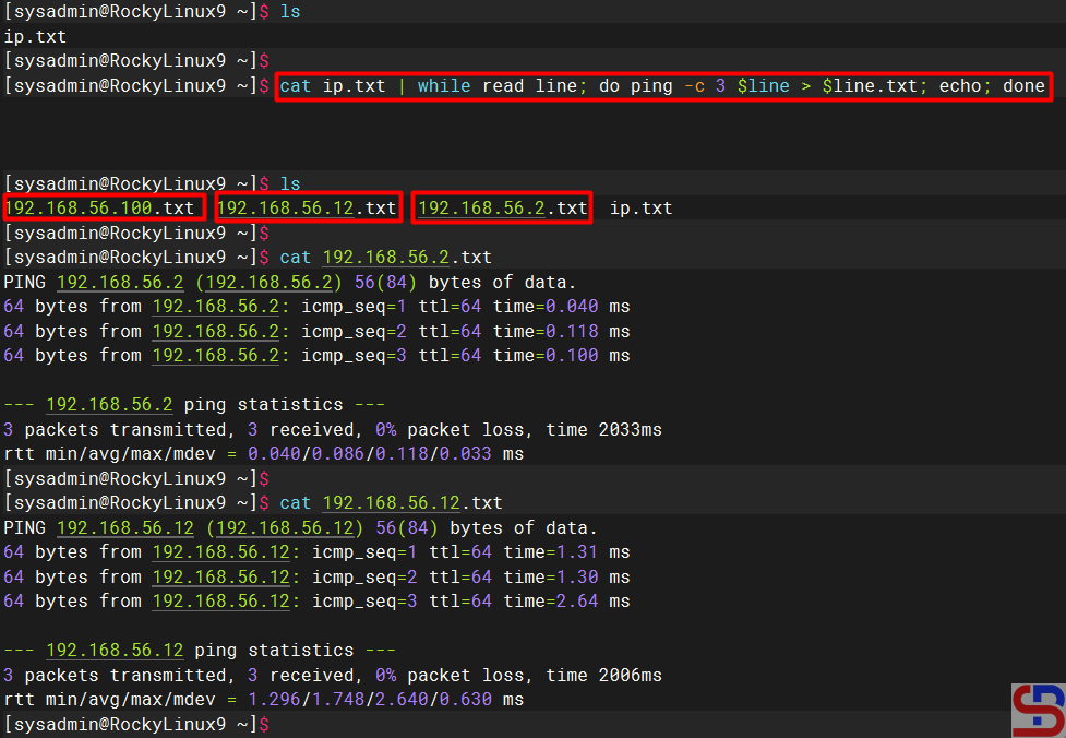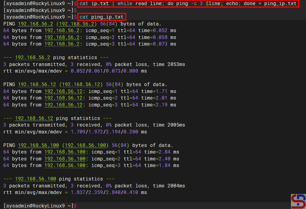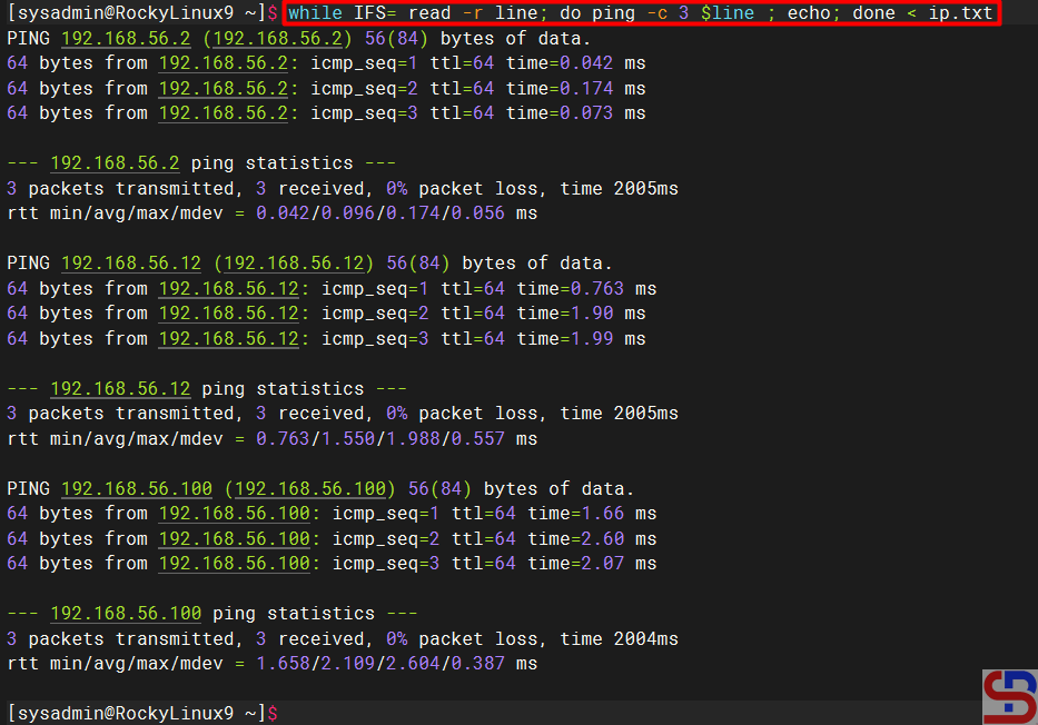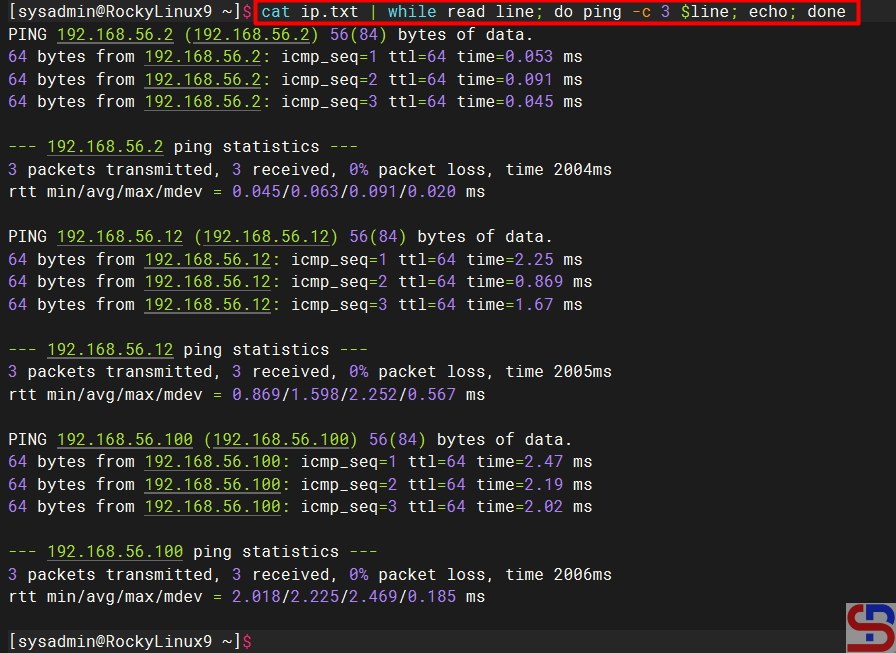 In this case, the format above has changed as below to ping each IP in the file: