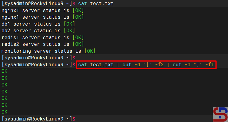 You can use one of the commands above to get the value between 2 special characters, and I use the cut command as in the command below:
