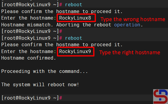 Now, try to do the reboot command and write the wrong hostname, and your Linux server shouldn’t reboot. However, try to write the correct hostname, then your Linux server should be rebooted, like in the image below:
