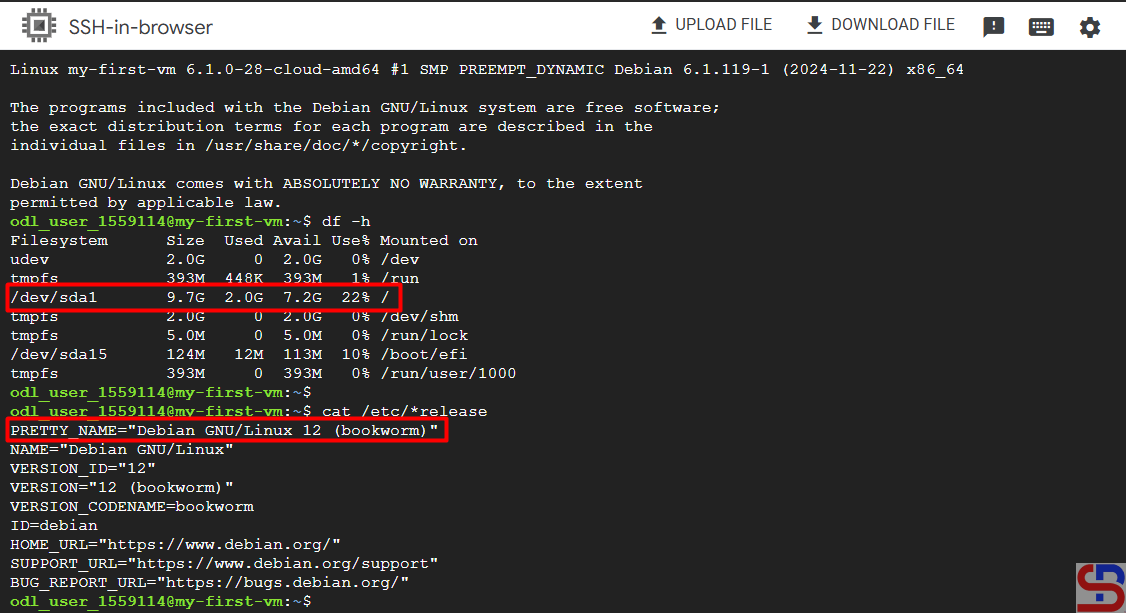 Use the df -h command to check the hard disk capacity, and it should match the additional HDD in the GCP (in my case, the HDD capacity is 20 GB):