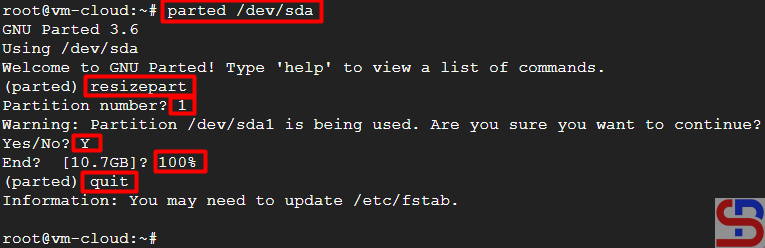 Use the command below to resize the partition: